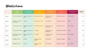 Een weekmenu ziet eruit zoals hieronder in beeld is gebracht. Je krijgt 6 eetmomenten per dag, 7 dagen per week. De recepten zijn afgestemd op